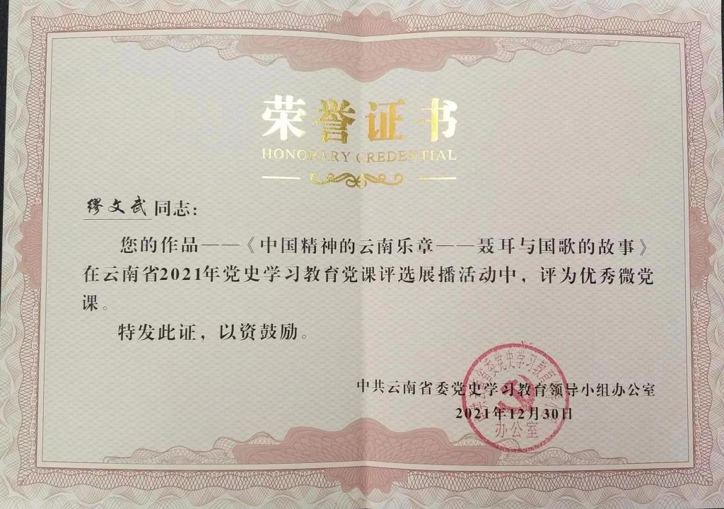 缪文武老师在云南省教育工委党史专题微课堂竞赛中,以《中国精神的云南乐章——聂耳与国歌的故事》为题,宣讲聂耳精神。经过激烈角逐,缪老师荣获云南省本科高校组优秀奖,为公司、公司争得了荣誉,再此以示祝贺。